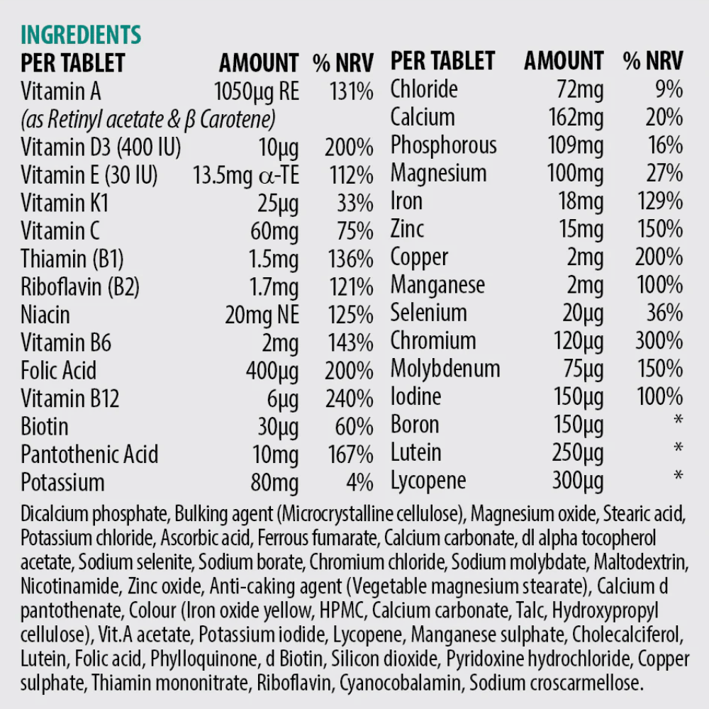 - Multivitamin/ multimineral with over 30 essential nutrients including Lutein and Lycopene