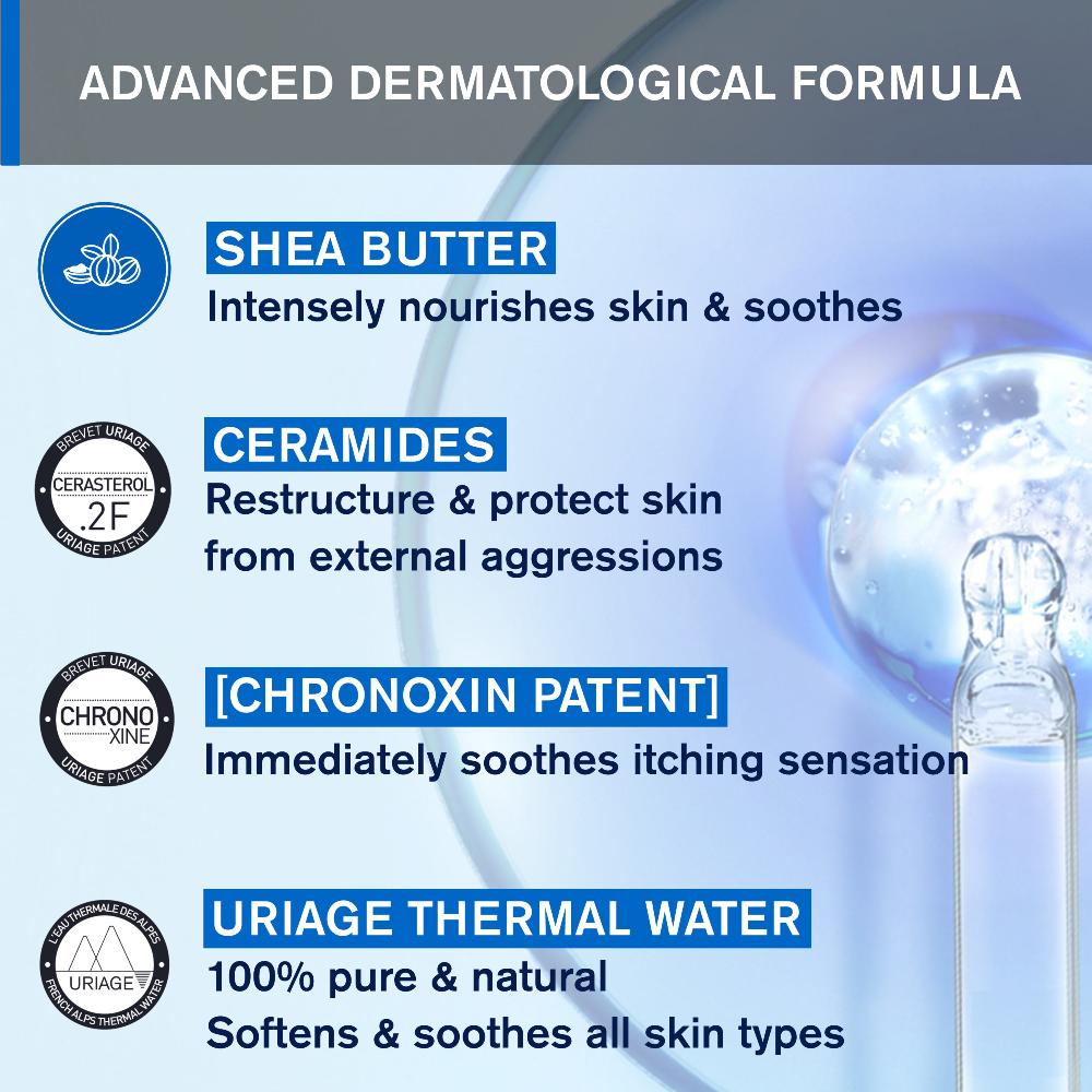 3 Uriage Patents: CHRONOXINE (Instant anti-itch), CERASTEROL.2F (restores and reinforces the cutaneous barrier), TLR2 REGUL (modulates the immune barrier) and Uriage Thermal Water (rebalances the microbial barrier), Shea Butter (5%)/ Illipe Oil/ Tested under dermatological control / Very High Tolerance.
